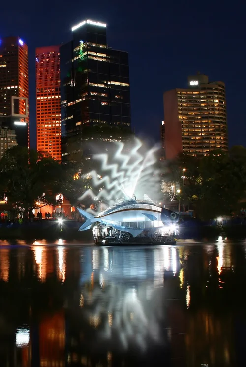 Entrance Area, 7x 16m tall seedpods. Dynamic programming from opaque scrim seedpod to sequentially blossoming LED Australian native flowers.